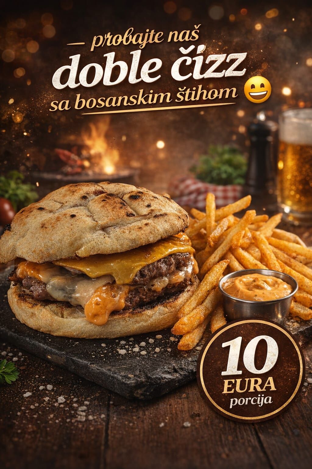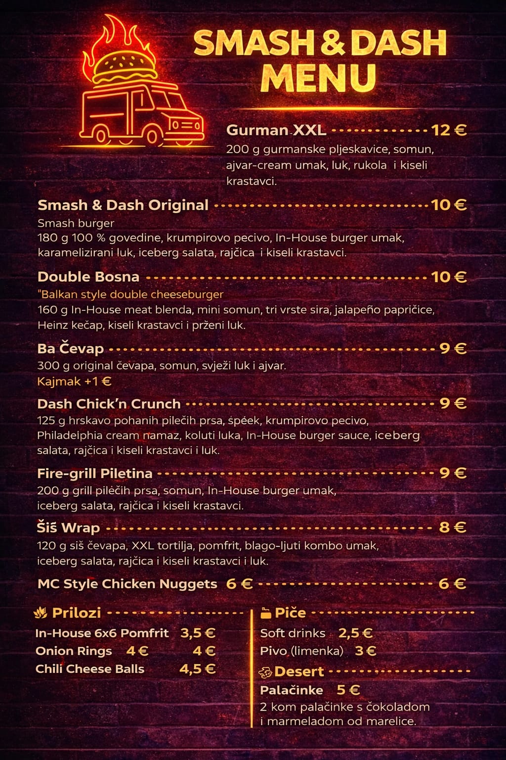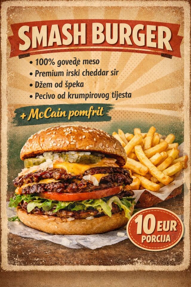 Najbolji smash burger u selu, top hrana, top kvaliteta, we spare no expenses, imamo i chicken burgere, ćevape, šiš, finger food za svakog gurmana, svježe pripremljene priloge i sosove, domaće pecivo i uvijek sočne porcije koje ne ostavljaju ravnodušnim.